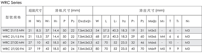 優(yōu)勢(shì)特點(diǎn):CPC直線導(dǎo)軌WRC系列與傳統(tǒng)的滑動(dòng)導(dǎo)引相較,滾動(dòng)導(dǎo)引的摩擦系數(shù)可降低至原來的1/50,由于起動(dòng)的摩擦力大大減少,相對(duì)的較少無效運(yùn)動(dòng)發(fā)生,故能輕易達(dá)到μm級(jí)進(jìn)給及定位。